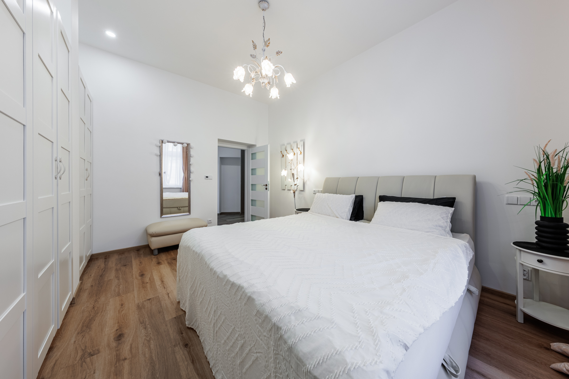 V zadní části předsíně se nachází prostorná ložnice s velkou postelí a obrovskými vestavnými skříněmi, které poskytují nadstandardní úložný prostor. Ložnice působí klidně a harmonicky.