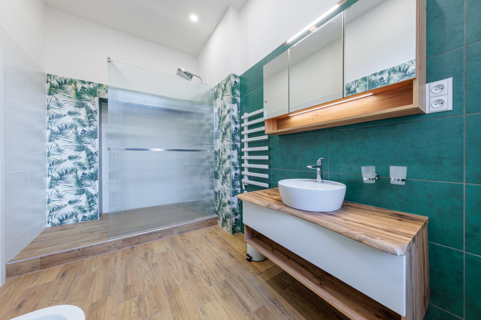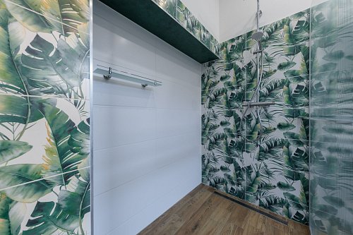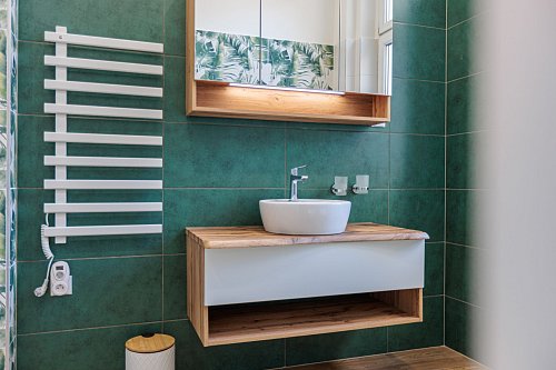 Vedle ložnice je velkorysá koupelna s opravdu prostorným sprchovým koutem, krásnou koupelnovou sestavou, umyvadlem, toaletou i bidetem. Celý prostor je řešen elegantně a s důrazem na komfort.