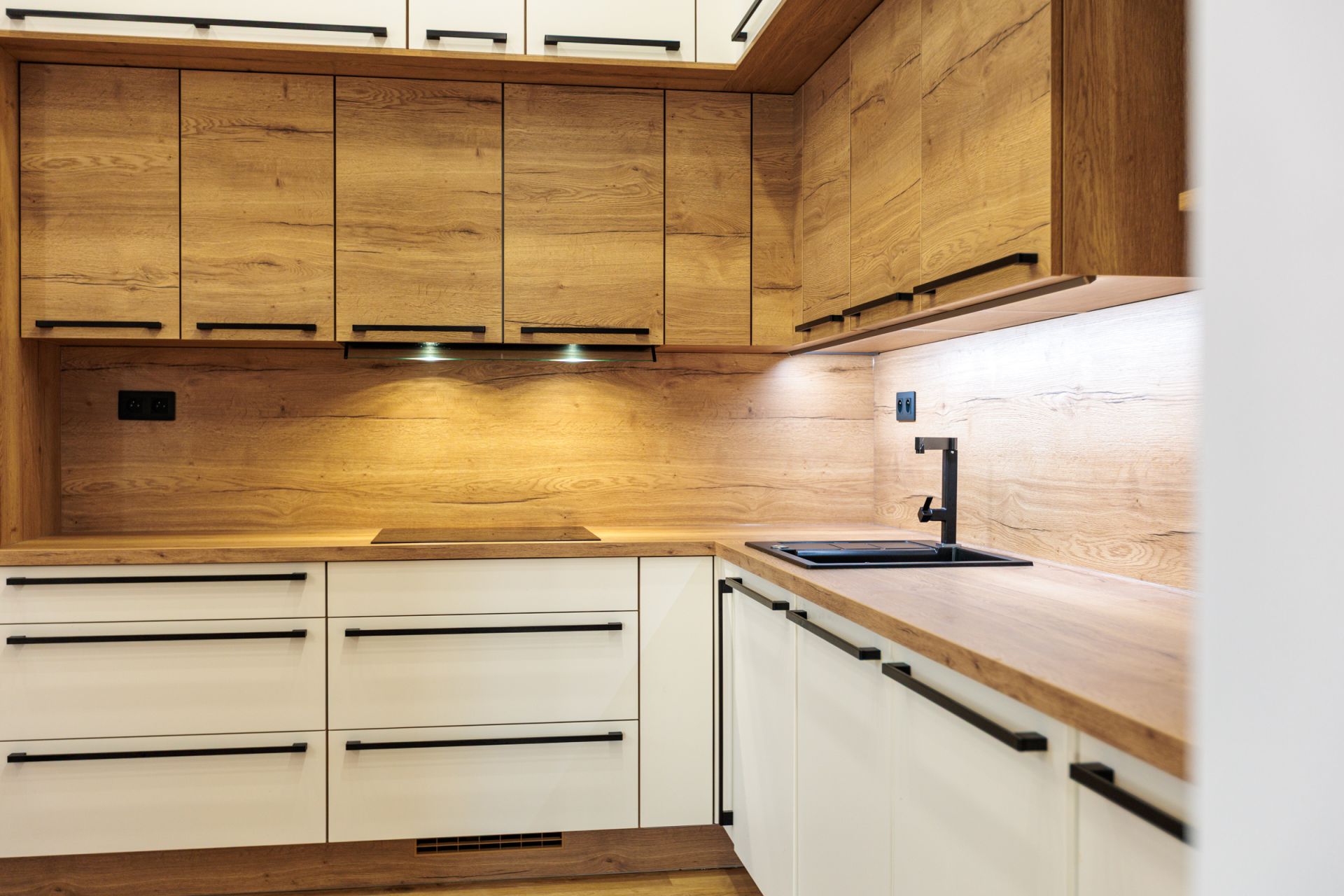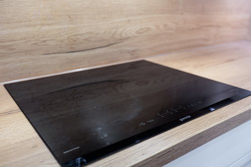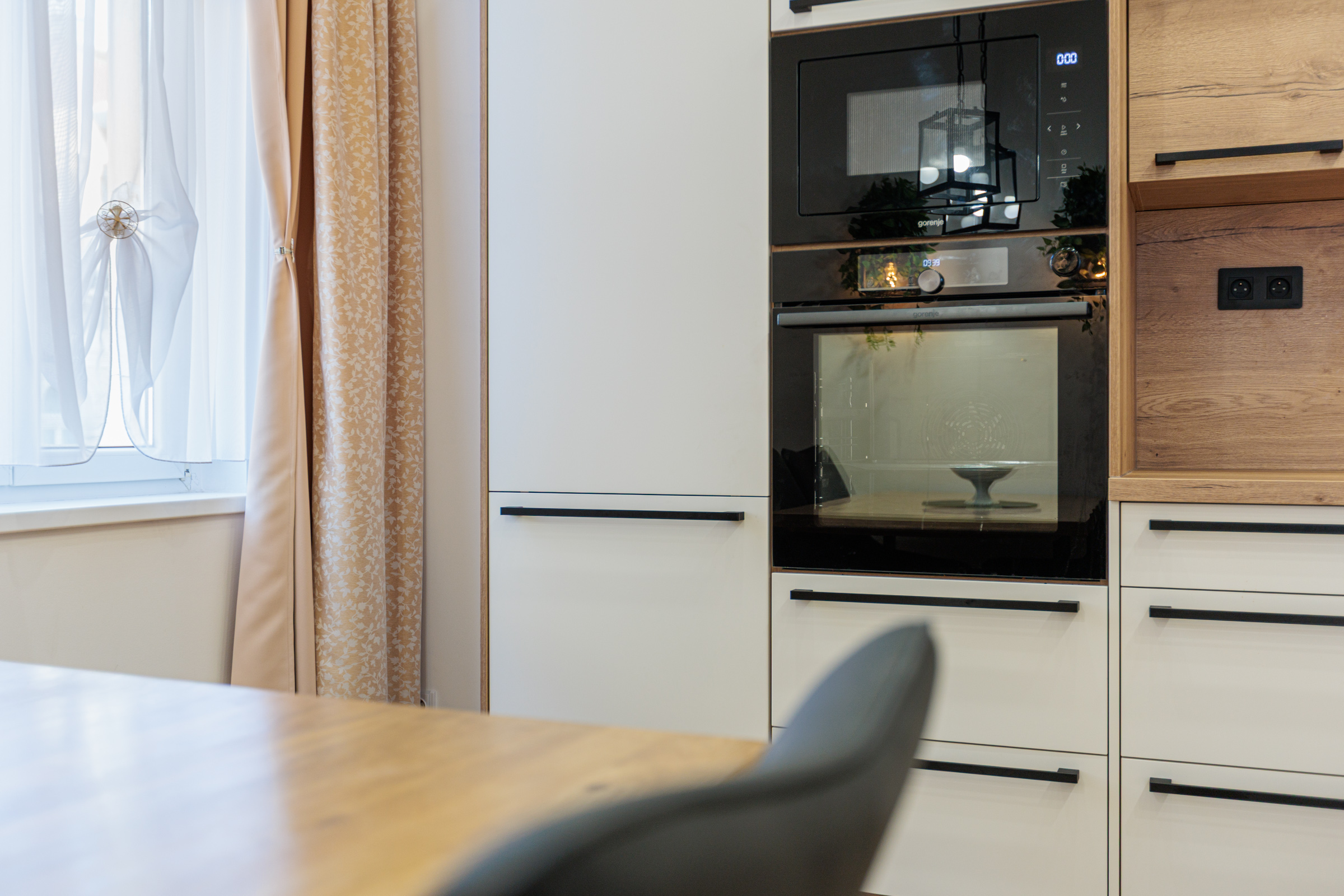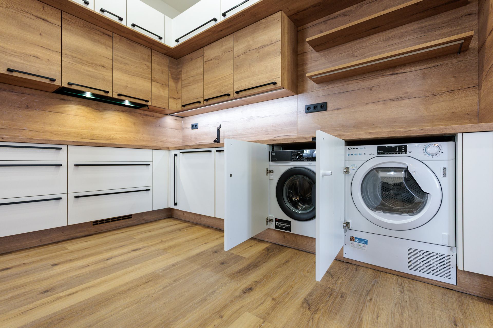 Kvalitní kuchyňská linka je vybavena vestavnými spotřebiči: myčka, pračka, sušička, varná deska, trouba, mikrovlnná trouba i digestoř. Vše elegantně zabudované, vše sladěné do moderního stylu. Osvětlení je řešeno citlivě a s důrazem na detail.