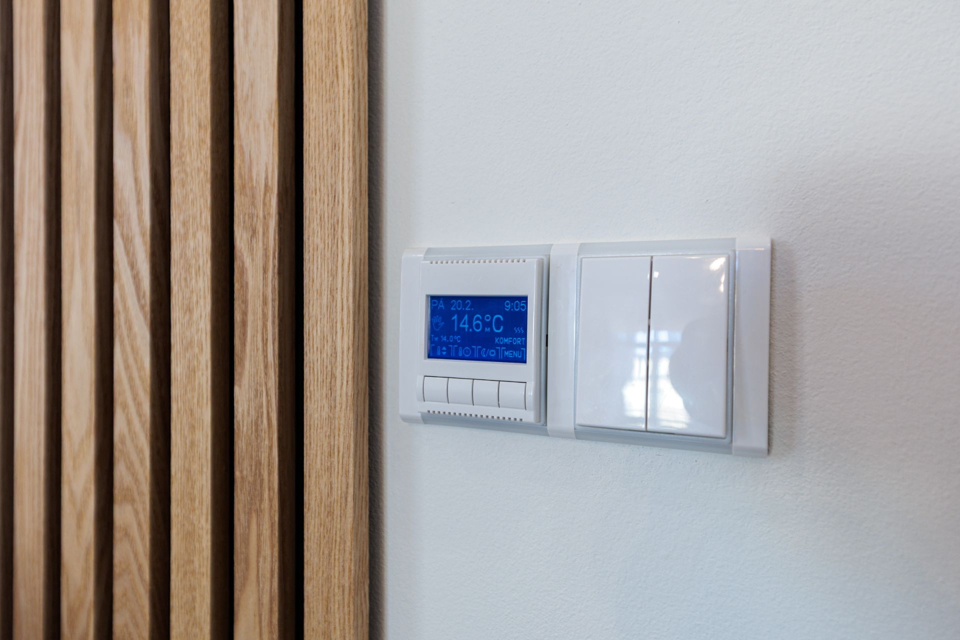 Po celém bytě je instalováno elektrické podlahové vytápění, které přináší příjemné teplo a moderní komfort. Nové interiérové dveře s obložkami a kvalitním kováním, designové obklady, dlažby, podlahy, krásné záclony, závěsy a dekorace – vše dohromady tvoří harmonický celek.
