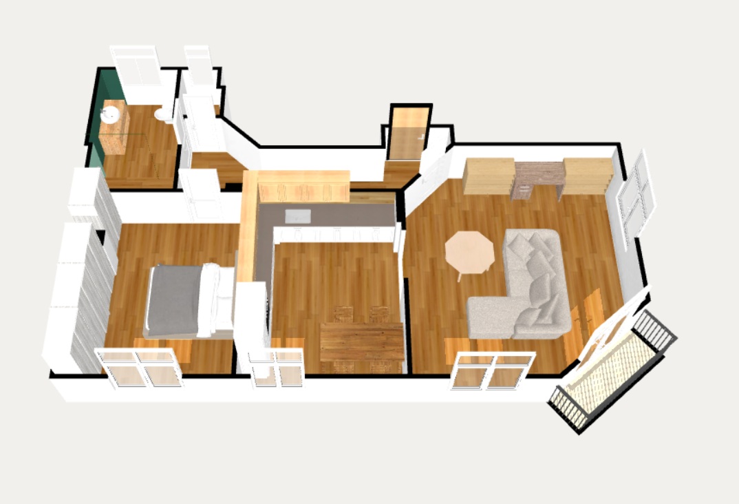 Rohový obývací pokoj s okny orientovanými na sever a západ působí světlým a otevřeným dojmem. V rohu místnosti se nachází francouzské okno vedoucí na balkon – jediný balkon v celém domě. Právě tento detail dodává bytu punc výjimečnosti. Ranní káva s výhledem na centrum města? Ano, tady je to možné.
