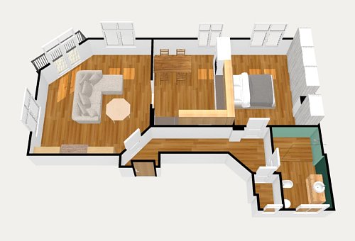 Dominantou bytu je velká předsíň, která přehledně spojuje všechny místnosti. Dispozice je praktická, vzdušná a velmi příjemná.