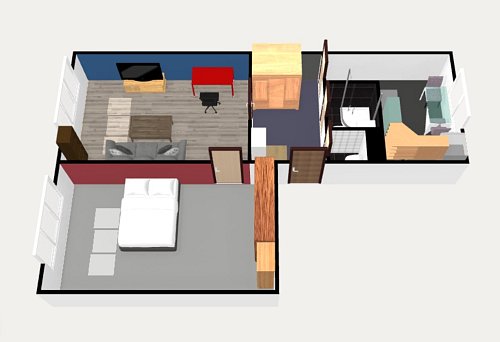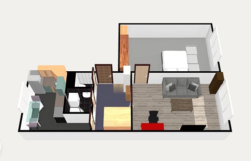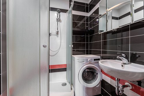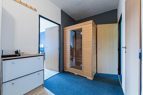 Dispozice bytu je velmi praktická. Kuchyň je orientována na sever, ideální pro přípravu jídla v příjemném světle, zatímco obě obytné místnosti směřují na jižní stranu, zajišťující dostatek slunečního svitu a tepla po celý den. Součástí prodeje je také infrasauna umístěná v předsíni, nabízející prostor pro relaxaci a regeneraci přímo ve vašem domově.