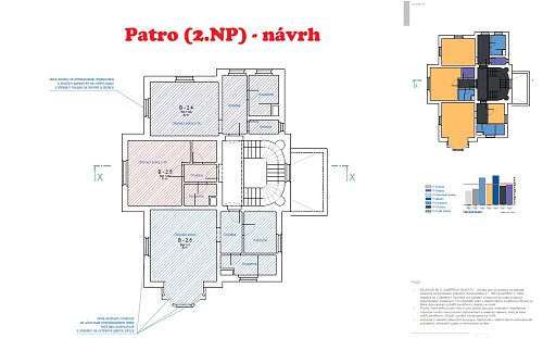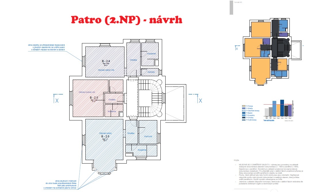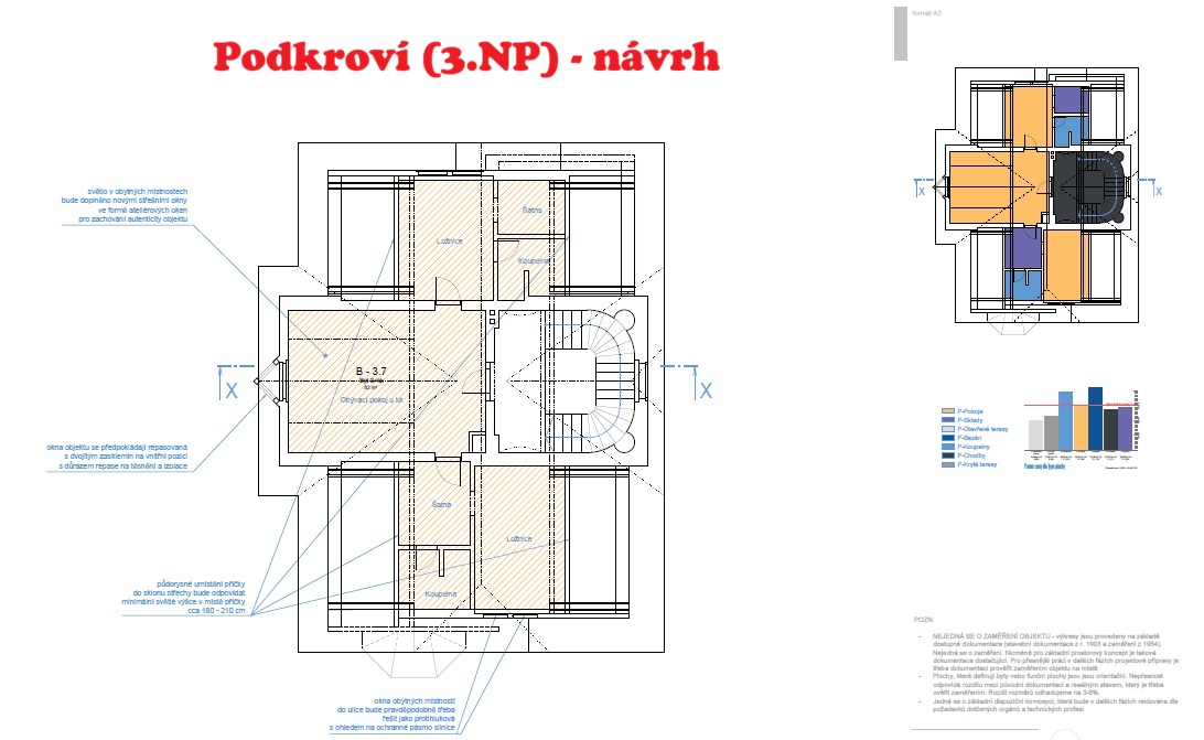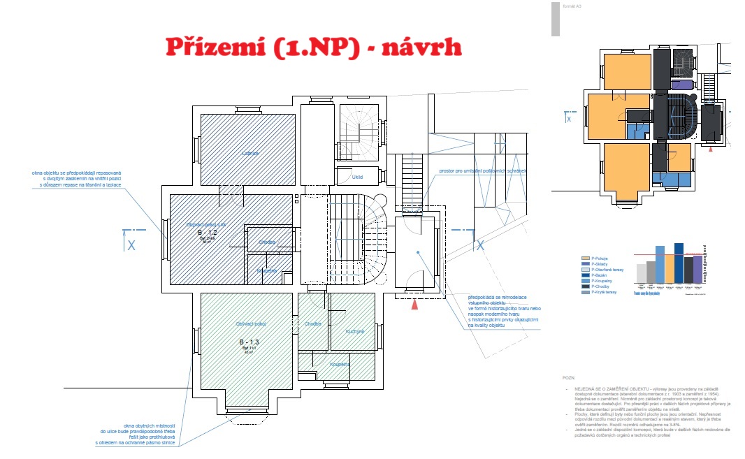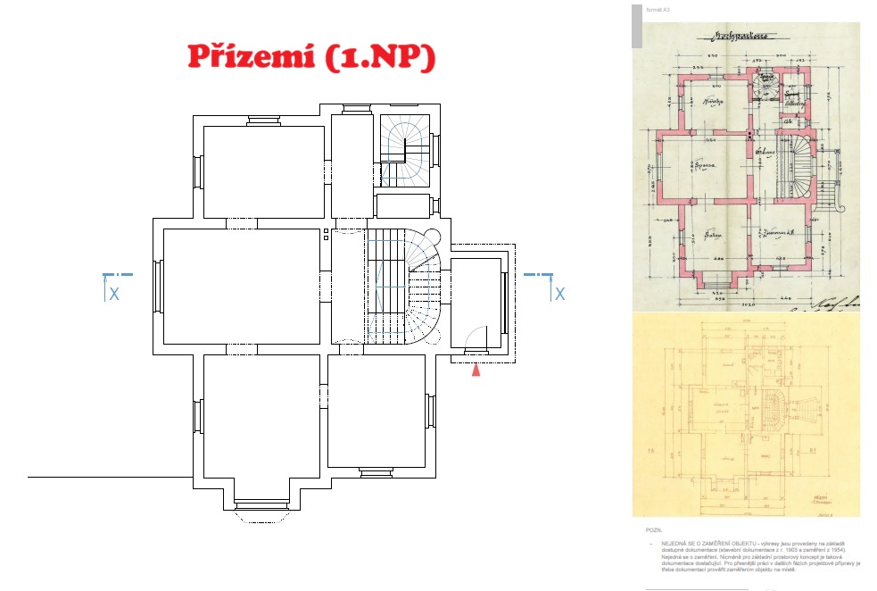 Díky dispozici a velikosti objektu existuje architektonická studie na přestavbu až na 7 bytových jednotek. K dispozici je také předběžná informace stavebního úřadu, která potvrzuje možnost změny užívání.