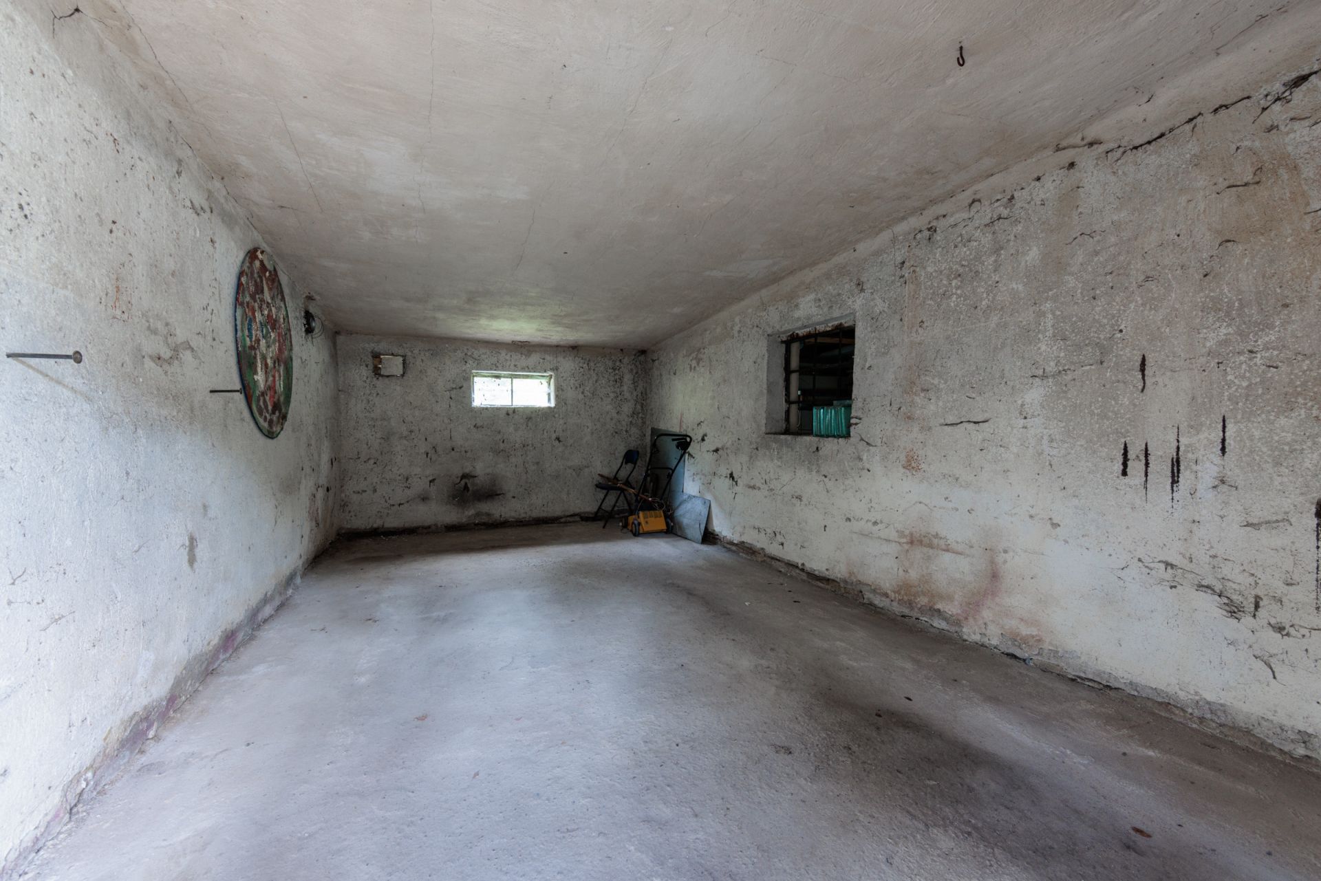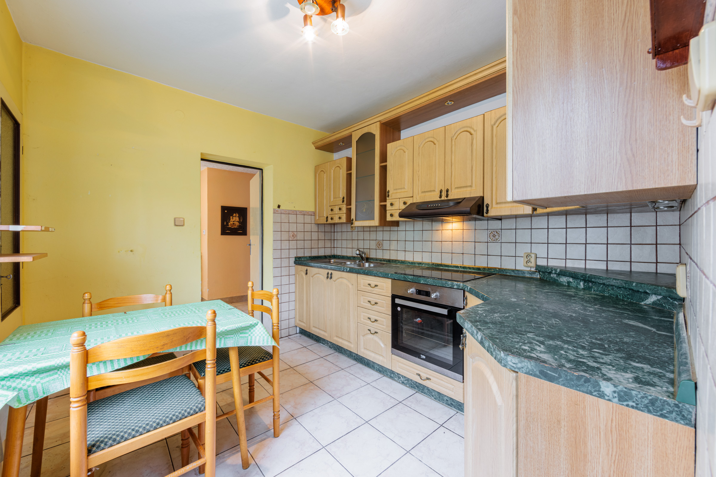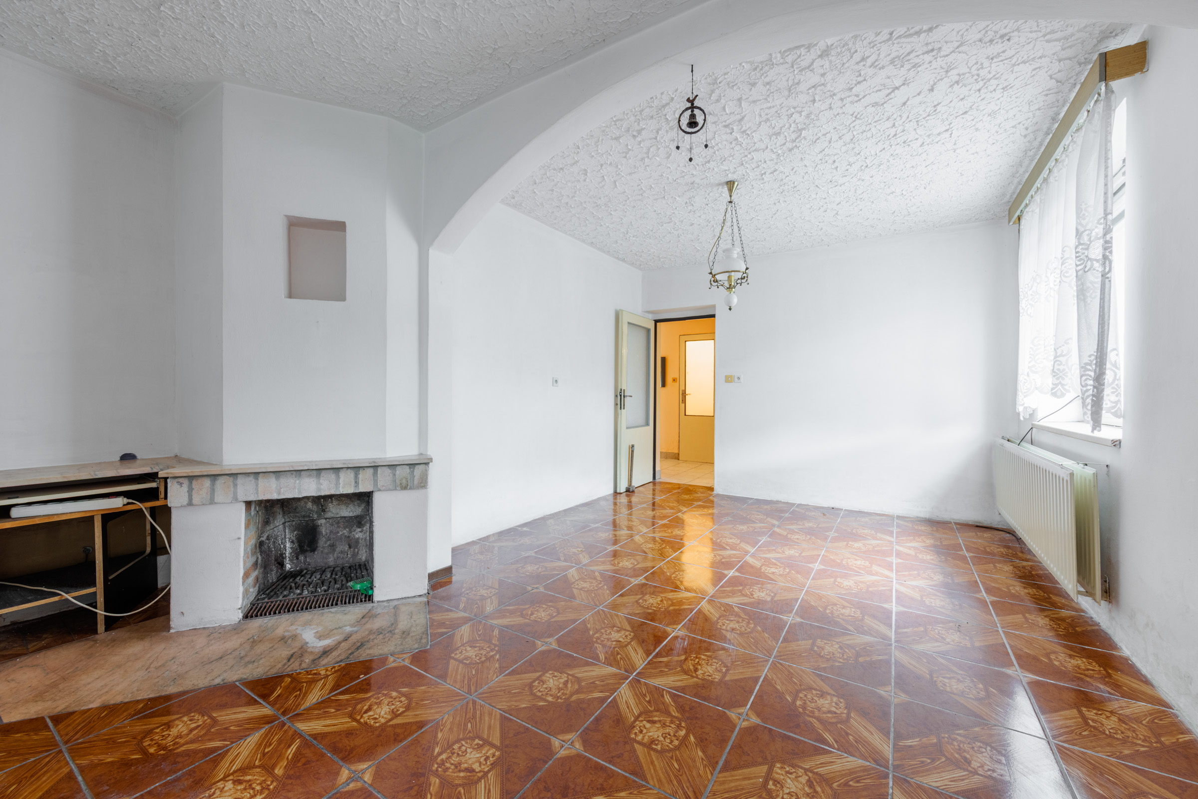 Z předsíně se vstupuje do prostorného obývacího pokoje s krbem, který je ideálním místem pro rodinná setkání. Z obývacího pokoje se dále dostaneme do menšího zadního pokoje. Další dveře vedou do kuchyně, kde najdete starší kuchyňskou linku a vstup do spíže. Z kuchyně je také přístupná malá chodbička se schodištěm, která vede do patra a také do uhelny vedle domu. Ve sklepě, který je přístupný z této chodbičky, je umístěn kotel na uhlí.