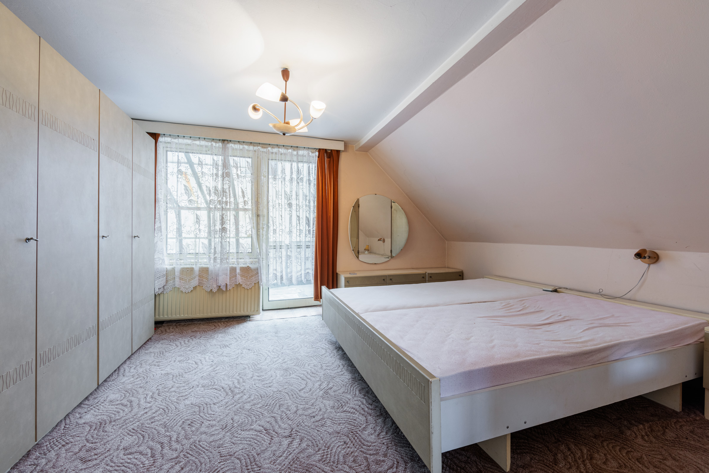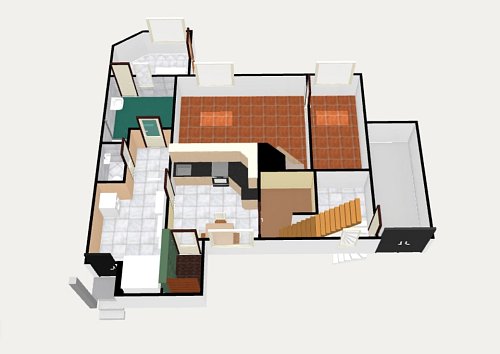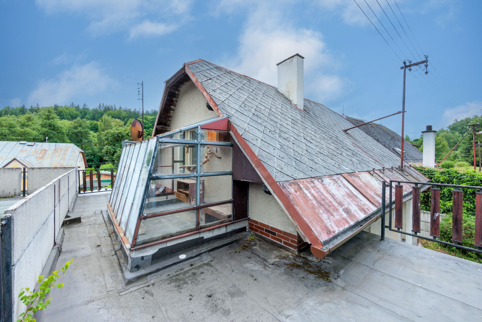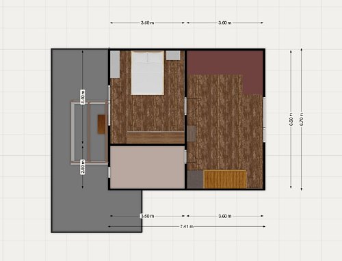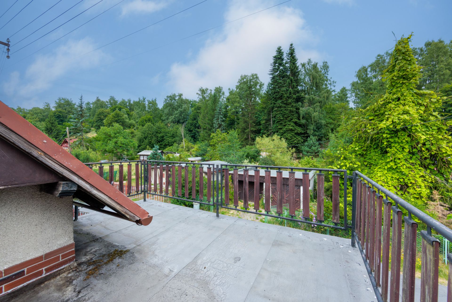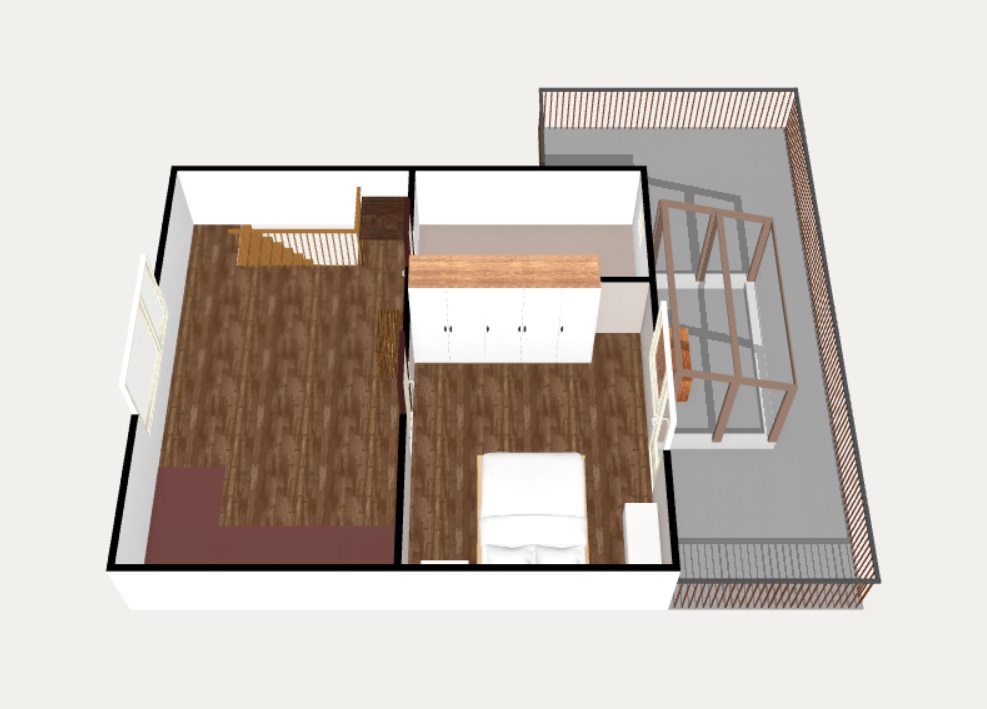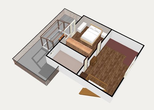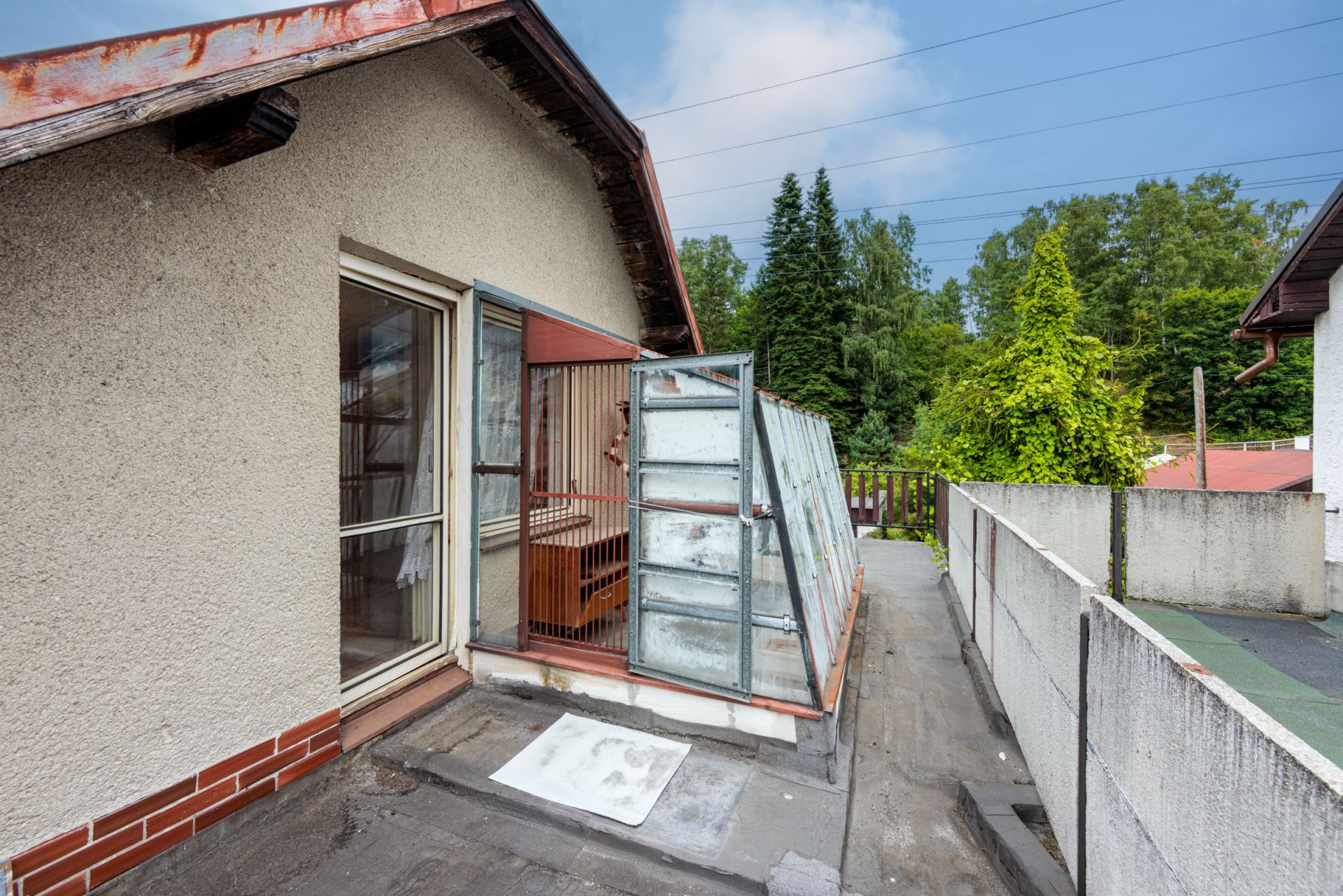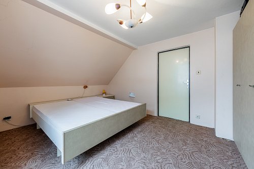 V patře se nachází velká předsíň, malá místnost se zkosenou střechou a prostorná ložnice. Z ložnice je pak přístup na velkou terasu s kočičí voliérou.